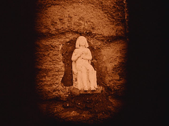 During the silent era, filmmakers used the vignette to draw attention to specific actions within their scenes; whether that was an actor—we might think of Jean Amsler’s distraught expression in Jacques Feyder’s Visages d’Enfants (1925)—or how it can isolate a gesture, an act, an event; as was used so effectively by D. W. Griffith in his gigantic Intolerance (1916): like the poised blades that will cut the rope leading to Robert Harron’s execution blade; when Mae Marsh so forlornly attends to a dead flower’s stem; or the voluptuous pale skin in the Babylonian harem. Here it was used intentionally; it was just one of the tricks of the filmmaker’s trade. Griffith used the vignette to pick out narratively significant actions in the pell-mell marbling of his scenes; there’s so much going on that he needs to nudge us, to draw our attention, to lure our eye: “hey, over here—look”. The vignette cuts away unnecessary “flesh”; it leaves that which is vital.