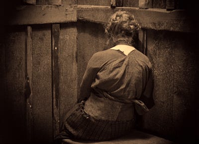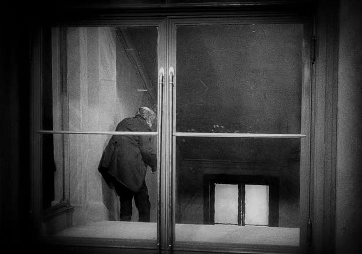 But the same focusing-looking-tightening of the vignette also works against the poor, forlorn, fatuous doorman. The vignette highlights his fall from grace, his demotion, the horrible secret of it that he carries with him. How shattered his pride is. When the rich guest jabs at his now shaggy, mortified body, demanding that Jannings clean his shoes, the camera looms down on him—his clothes scruffy and rumpled, no longer neat and puffed up. The vignette tightens Jannings’ sorrowful face, hides the detail of the rich man’s body—now we see only his hand jabbing and the bright lit tip of his pointed beard; so unlike the unkempt mass of Jannings’ own. Here, the vignette works both ways; building up and throwing down.