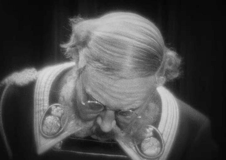 Murnau’s vignette—it’s very soft here, barely a gentle furze of trembling darkness—keeps our focus tightly kept on faces, on the Kammerspielfilm aura of effects, on the inner lives of the people we’re seeing on screen. When he preens his carefully kept head of hair and bushy beard in the mirror, we see his daughter cooking in the reflection. The vignette eclipses his line of sight, connecting Jannings and his Maly—soon to be married. Now he turns, fondly, affectionally; Murnau’s camera not losing focus on Maly’s patient work. The line of sight—though it’s been reversed; pushing back through us—remains fixed on his daughter. Jannings’ soft, out-of-focus head reminds of this; it’s a clever visual metaphor; saying, “you’re seeing what’s inside the old doorman’s head—the person he most cares about”. It’s literal, figurative, quiet; and Murnau does it all—this hazy piece of impressionistic perspectivalism—with a softened edge to the frame. Our eyes don’t flick left or right. We look ahead.