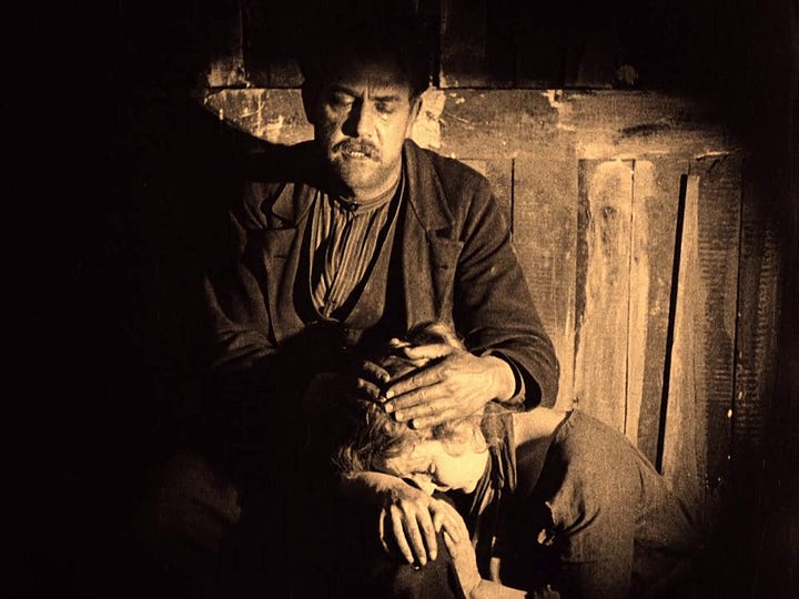 Mirriam Cooper’s face is vital. The “Friendless One”. Her eye trembles on the edge of tears. Here, Griffith wants us to spend a moment with her; to drink in the weight of her terror after shooting down Walter Long, “The Musketeer”. Harron will stand trial—unfairly—in her place. The vignette eradicates the walls, the room, the people around her. Living inside her guilt, with the probability of Harron’s execution; she is entirely alone.1