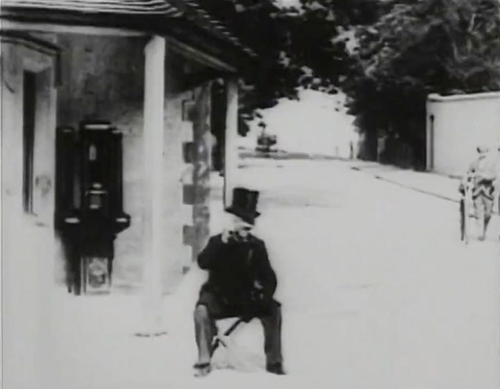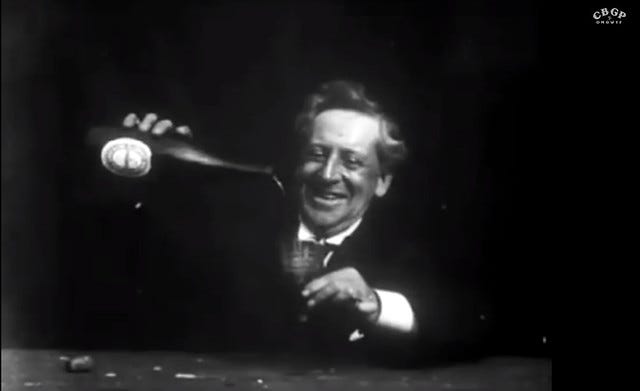 The whole thing was assembled through a careful kind of stop-motion; interlinking Dalton’s walking approach, the “swallow”, and his now satisfied retreat. It is wily and strange and funny in the manner of G. A. Smith’s own Old Man Drinking a Glass of Beer from 1897, where Smith had first kidded around with the idea that the camera didn’t need to be yards and yards away from the performer. Instead, we’re close; we see the bottle, the old man’s upper half, his increasingly lively hands, his gurning face.
