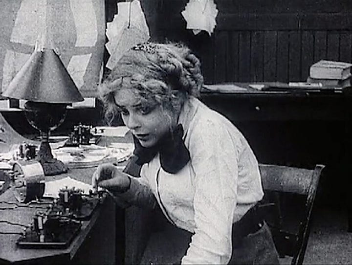 Given another decade and loose change, however, close-ups had become part of the filmic furniture. Just think of Louis Feuillade’s obsession with them in his episodic Les Vampires (1915-16)—or Giovanni Pastrone’s up-close adoration of rings and treasures in his sprawling Cabiria (1914). The close-up untethered filmmakers from the disruptive fussiness of intertitles, just as it drew attention to things that the audience needed to take note of: bottle of poison, wrench, exposed calf. Etc.