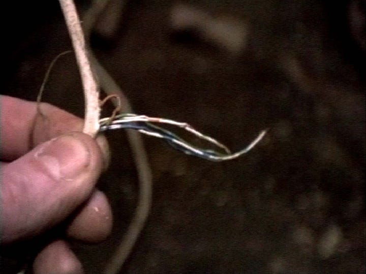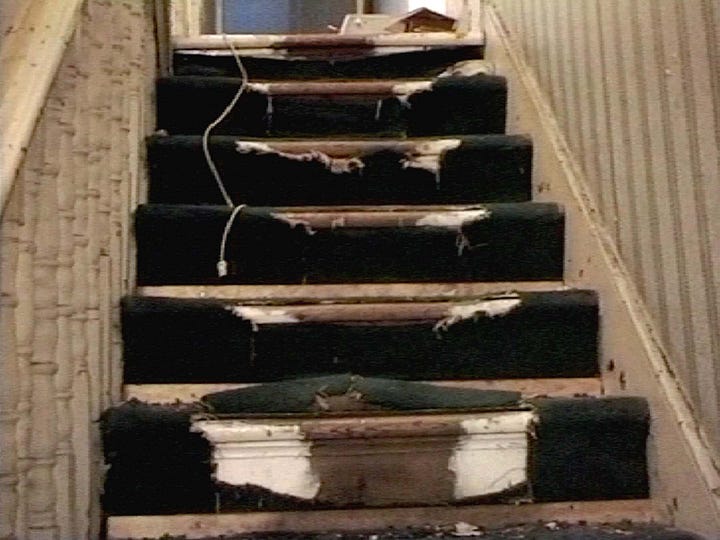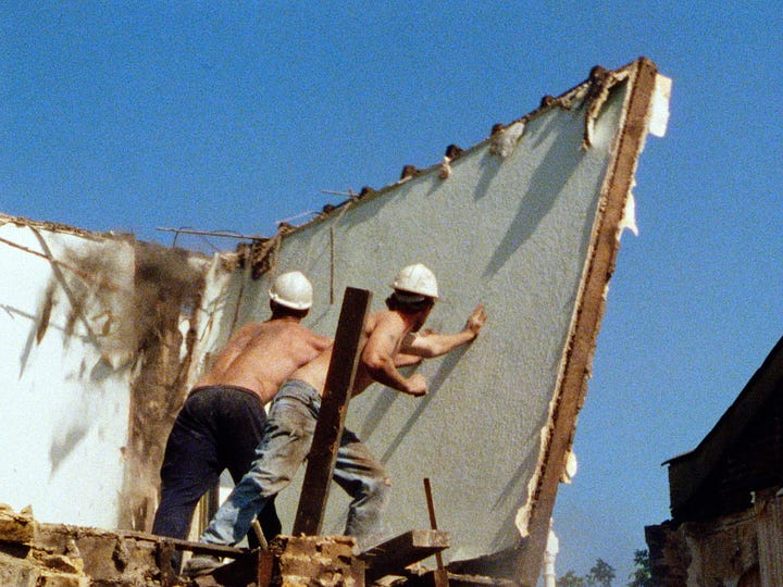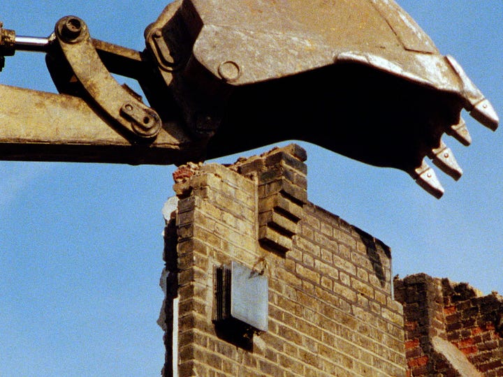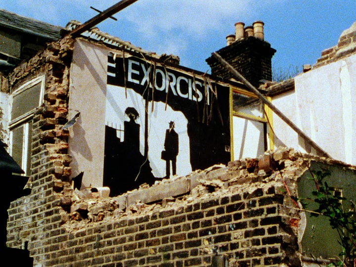 During our walk, John mentioned yet another example of ‘displacement’; telling us how the idea behind The Waste Land (1999) came from a toilet sign he’d seen in reverse — reading it as a kind-of anagram for T.S. Eliot. So, he filmed a scene in a pub’s lavatory that was also a meditation on Eliot and on the correspondences and confusions that bubble up between words, images, and things. Naturally, he shot this film in his (then) local boozer; when he mentioned this, we were standing a few yards from its front door. In Blight (1994-96), we witness the demolition of one of the houses along John’s street; where each shove and hammer-blow reveals another bit of sky or another bit of disemboweled domestic intimacy. One such shot reveals a poster for The Exorcist; during our walk, John wondered if the M11 link road — and the demolition that preceded it —was really a kind of "exoticism" of the street and the people who lived there. Here’s another example of displacement serving as a kind of meaning-making.
