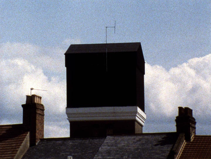 It’s why I believe that towers and other kinds of “tall” things feature so prominently in John Smith’s films; they are impossible not to see as we go about our lives. The tower blocks he plays with in Hackney Marshes loom up from the fields and cannot but draw our eyes and attention; he cuts rapidly between them, adjusting the angle to discover matches and disjunctions between each adjoining image. The same logic held sway in The Black Tower, where we see the unavoidably dense stab of blackness from many alliterating angles — showing us both how the view changes and how it remains the same. It might be a kind of pattern recognition; or pattern misrecognition; or it could be both things at the same time.