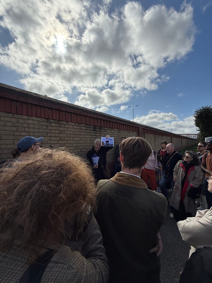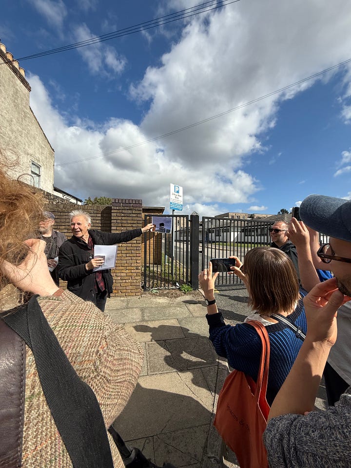 With John Smith as our master of ceremonies, we gathered against a tallish brick wall behind which could be heard the dismal droning of the motorway-that-is-not-a-motorway while John asked us to imagine the spectral memory of his house hovering in space, a little way over there — to our left.