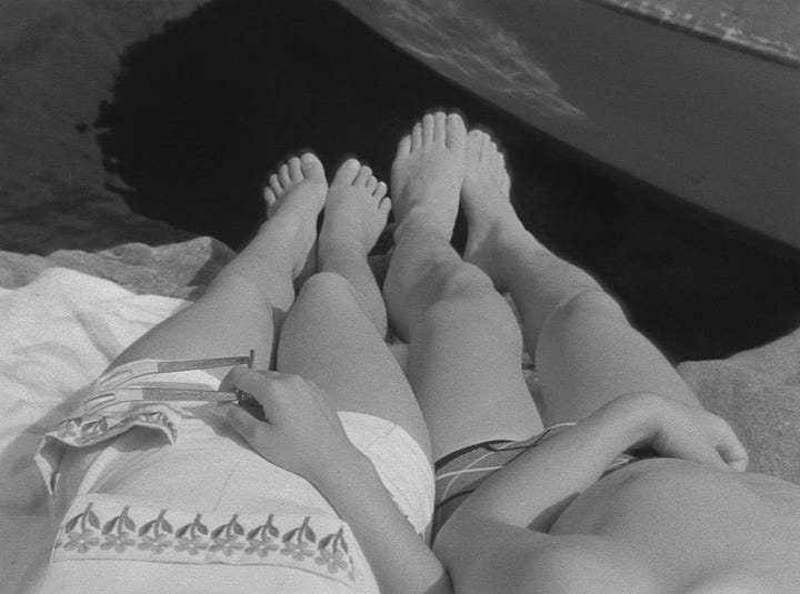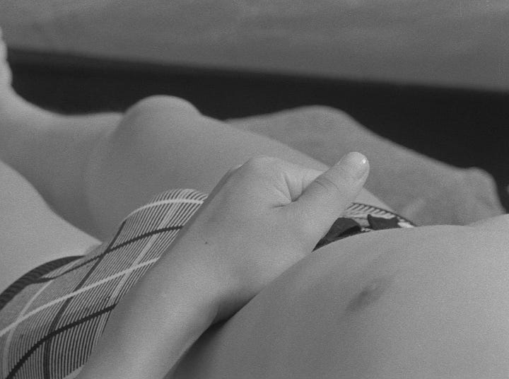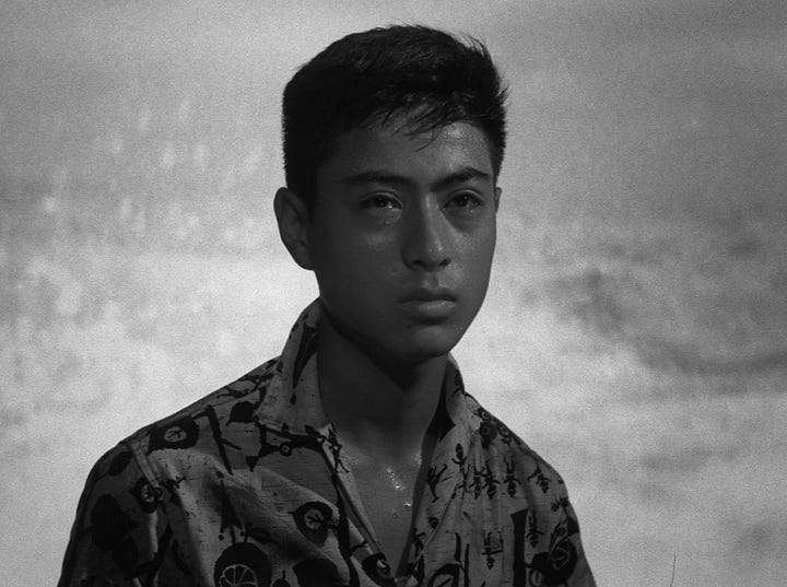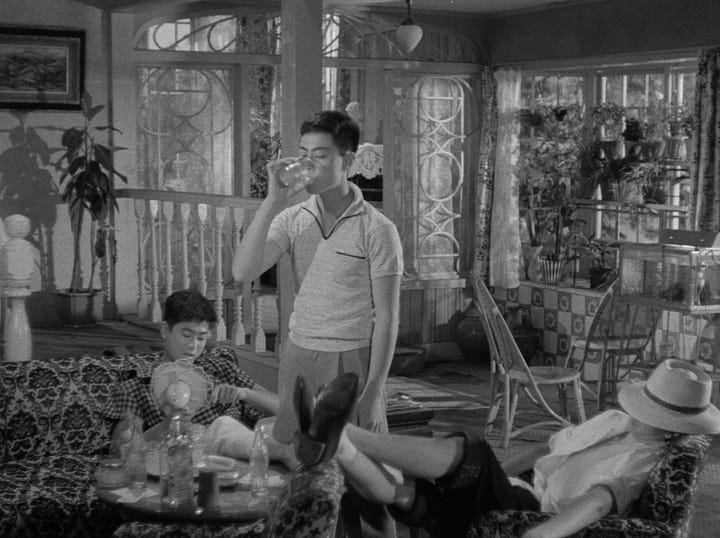 It would fall to Kō Nakahira, and his Crazed Fruit, to properly splay out the aesthetic credentials of the taiyozoku. His 1956 program film (care of Japan’s long-in-the-tooth Nikkatsu studio) has all the roughly-hewn and scandalously too-cool energy of Japan’s newly doomed youth. Its story is one of frustration, liberation, narcissism, and nihilism—and the American-style bars and bourgeois villas that these seemingly unparented kids spend the movie haunting. Nagisa Ōshima saw it as epochal, how “in the sound of the girl’s skirt being ripped [...] sensitive people could hear the wails of a new age in Japanese cinema”. But here’s the (interpretive) rub: the scene in question (it’s a pivotal moment; one that seals two deaths) doesn’t feature the sound of a ripped skirt, but only the image of it—and Nakahira’s camera is already panning away. Ōshima had heard the tear, but he hadn’t listened to it.
