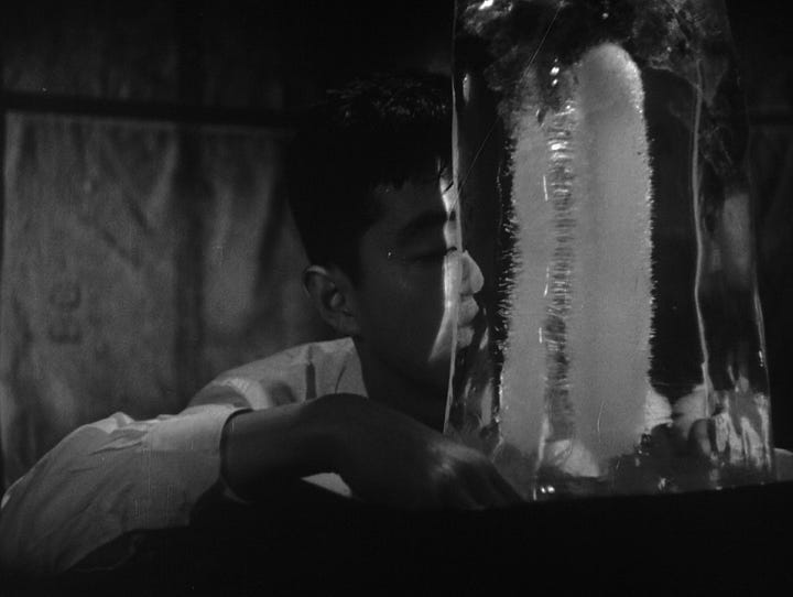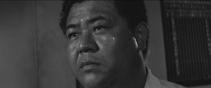 I’m trying to avoid the inertia of listicles, but “sweat” is so pervasive a symbol that it comes up thick and fast. There’s Yoshitarō Nomura’s Stakeout (1958), where —again—we spend time pressed up against roomfuls of perspiring cops, or Kon Ichikawa’s Heat and Mud (1950), which pulses with the anxiety and desperation that this era’s cinema so greedily fed on, or his later Conflagration (1958)—where an act of arson becomes a defiant symbol of postwar rebellion. Burning things, burning up, burning out; it’s all up for (sweaty) grabs.