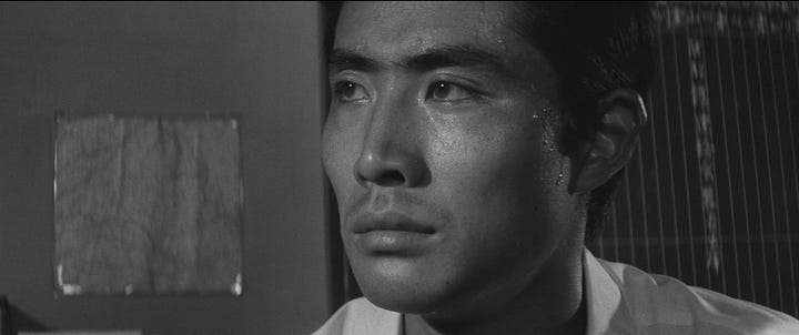 Memories of Hiroshima, or an uncomfortable embrace with commerce and capital—or why not both; as Japan grappled with its past and set its eyes on its future (there’s a neat, handheld bit of blurbing for you), the country convulsed with images, and realities, of criminal desperation, loosening morals, and an unkickable dope habit—all of it, as Akira Lippit argues, tangling together into a new cinema that was at once national (Japan as it saw itself) and international (Japan as it was perceived by a global community of film festivals and their audiences). Sweat seeps through as the unctuous cinematic symbol of a society that trembled with all manner of “beasts” and “bastards” (or so the long-haired mouth of Seijun Suzuki put it). Nobody—in this clammy climate—was spared the inclemency of this weather.
