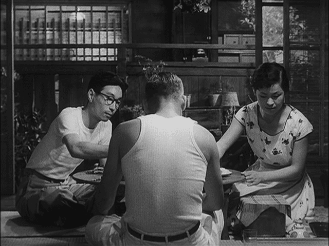 First, I thought the “big sweat” was simply a condition of cinematic production in postwar Japan—the necessity of bright available light and summer-long shooting; but the more time you spend with the big sweat, and notice it pooling toward you, the more it comes to feel like a necessary instrument—a forward and highly signifying device that is doing no small amount of fanning and waving of its own.